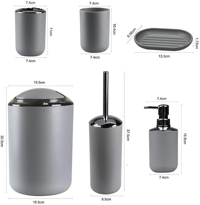 Bathroom Accessories Set, 6-Piece Plastic Gift Set, Toothbrush Holder, Toothbrush Cup, soap Dispenser, soap Dish, Toilet Brush Holder, Trash can (Grey)