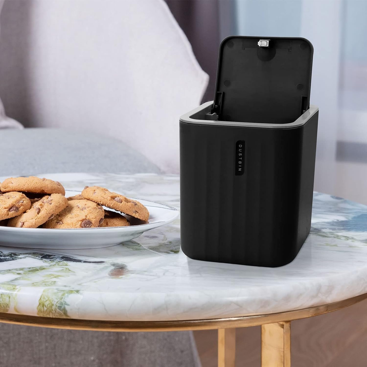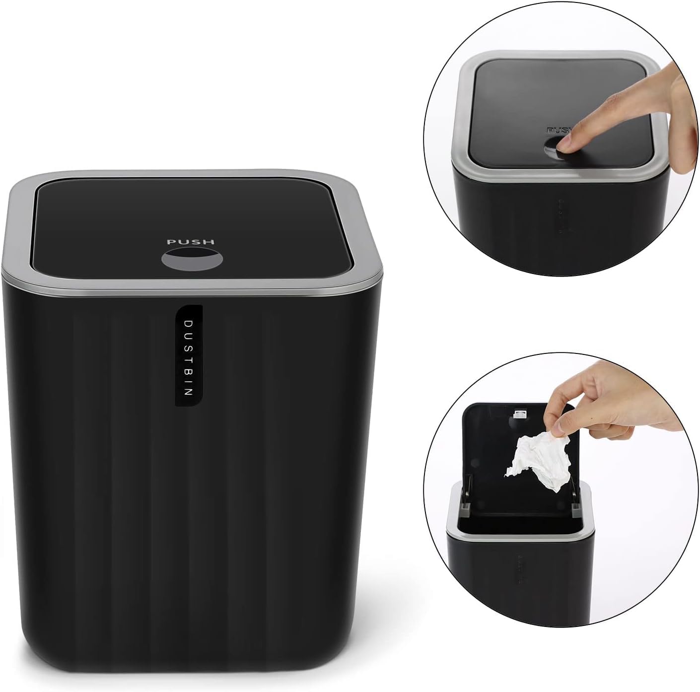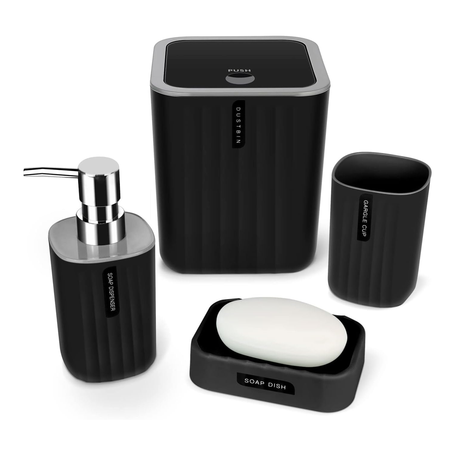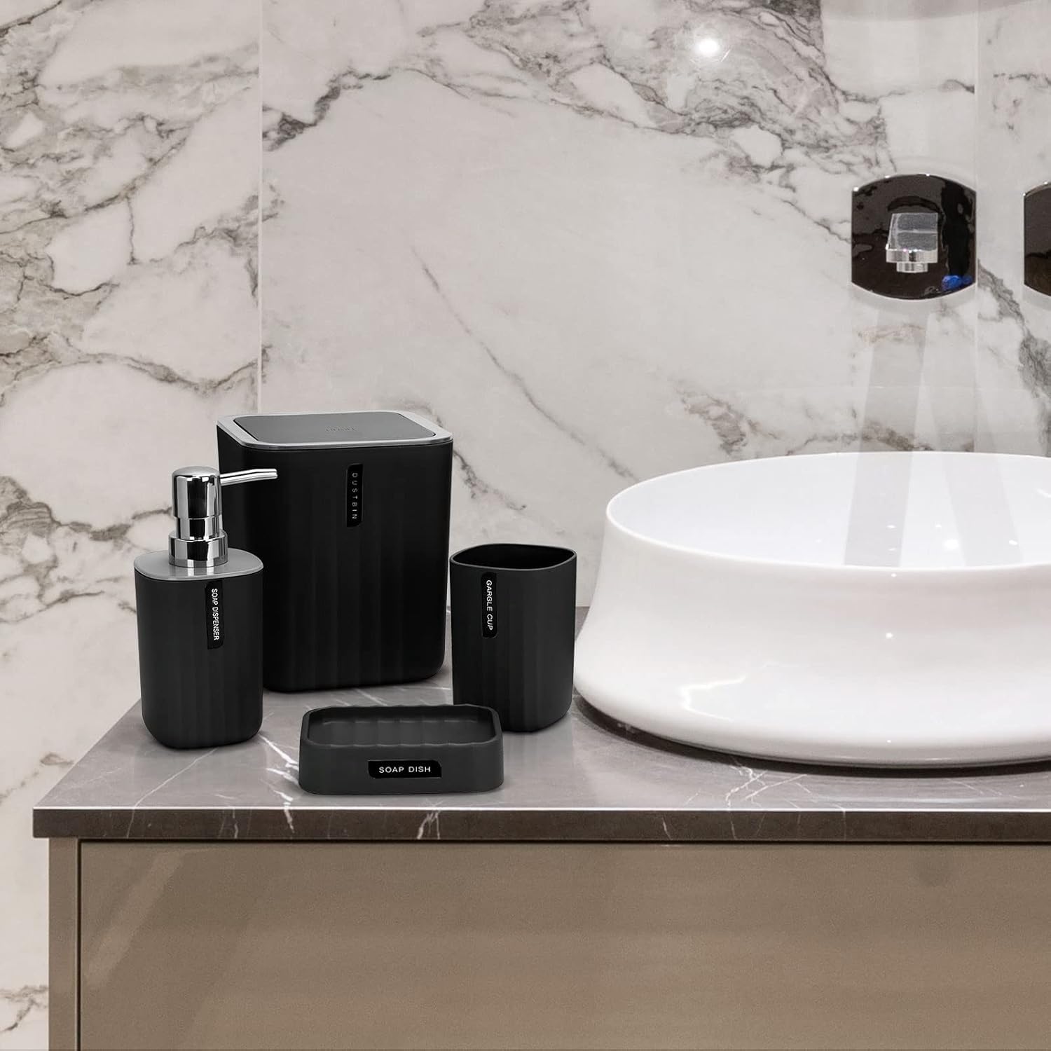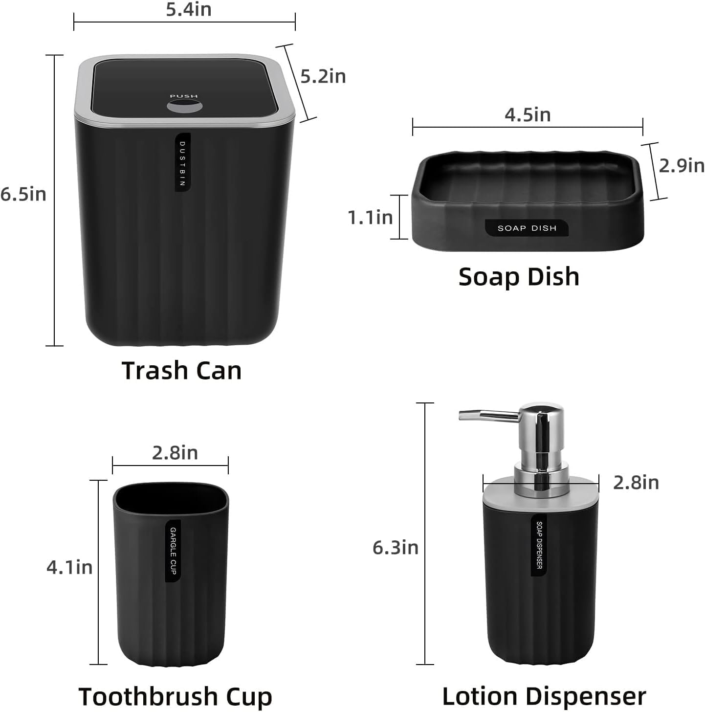 Bathroom Accessory Set,4-Piece Bathroom Decor Set,Soap Dish,Soap Dispenser,Toothbrush Cup,Mini Trash Can with Lid,Bathroom Accessories Set Complete with Small Desktop Trash Can(Black)