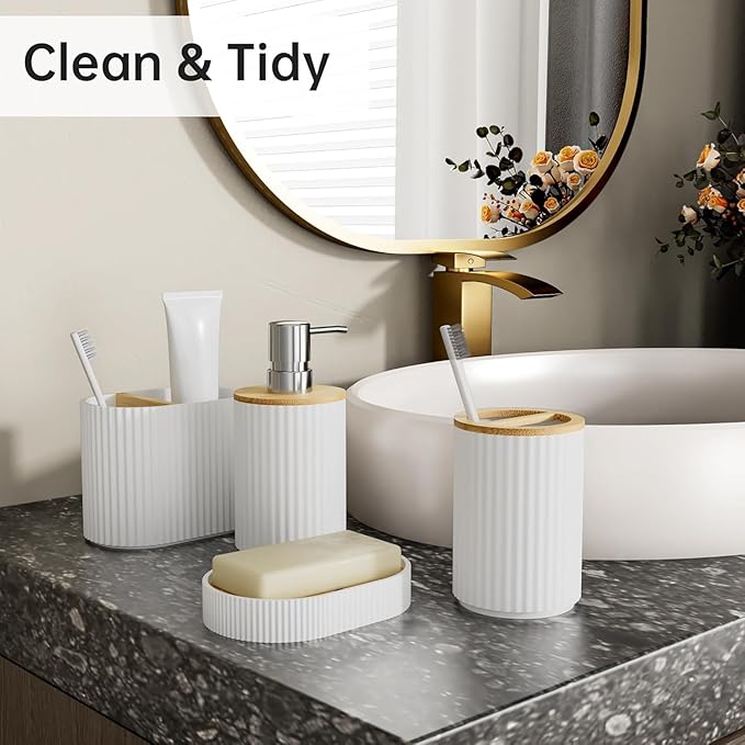 - FULLY FUNCTIONAL COMPLETE SET – A complete bathroom accessory set that includes everything you need to organize your toiletries. The toothbrush holder features two different-sized openings, a small one for toothbrushes and a larger one for toothpaste, making brushing teeth easy with everything in one grab.