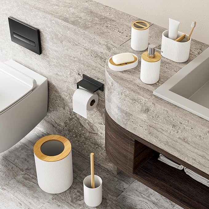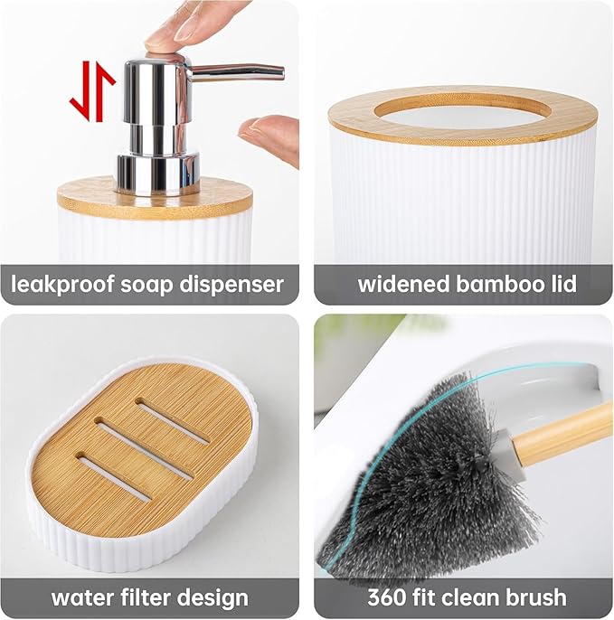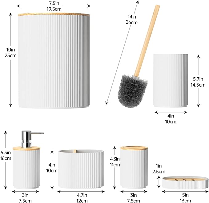 - PACKAGE INCLUDES – 1 Soap Dispenser, 1 Toothbrush Holder, 1 Toothbrush Cup, 1 Soap Dish, 1 Toilet Brush Holder,1 Trash Can