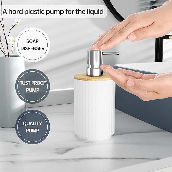 - PREMIUM QUALITY LIQUID SOAP DISPENSER PUMP – We know how frustrating it can be to use a flimsy pump that leaks or just doesn’t work. No matter how your bathroom set looks, a bad pump can ruin the experience. That’s why we included a sturdy plastic pump for the liquid soap dispenser in this set.