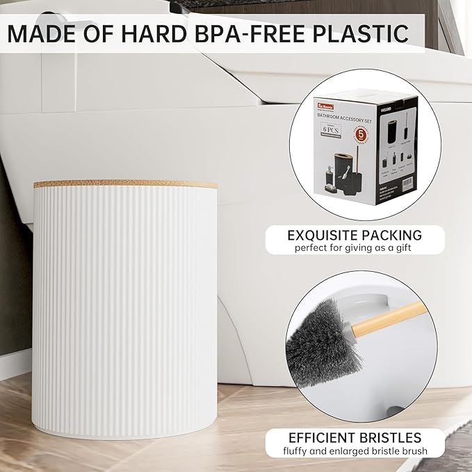 - DURABLE & AMAZING QUALITY – This 6-piece bathroom accessory set is made of durable plastic that can outlast competing products. It’s also ideal for kids’ baths due to its durability and the fact that it’s not as easy to break as ceramic sets. Our high-quality plastic bath accessories will withstand constant use, keeping their look just as elegant and new over time.