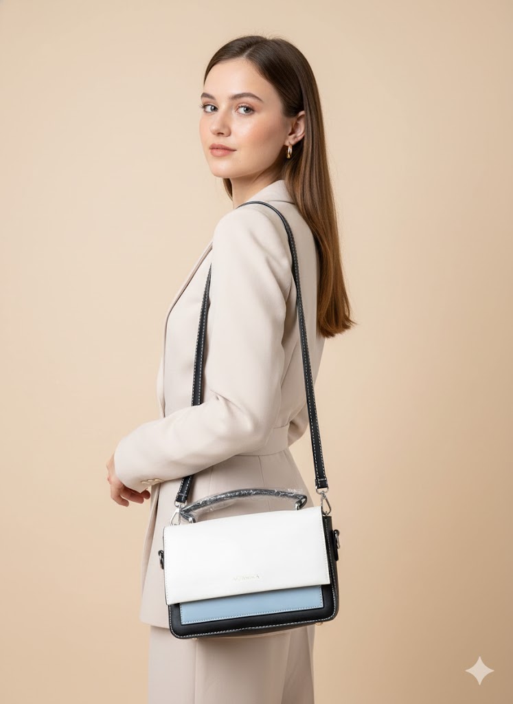 Upgrade your style with the elegant Vernika Luxe Contrast Handbag, designed for modern women who love sophistication. Featuring a chic white flap with black body and subtle blue accent, this handbag offers a perfect blend of class and functionality.