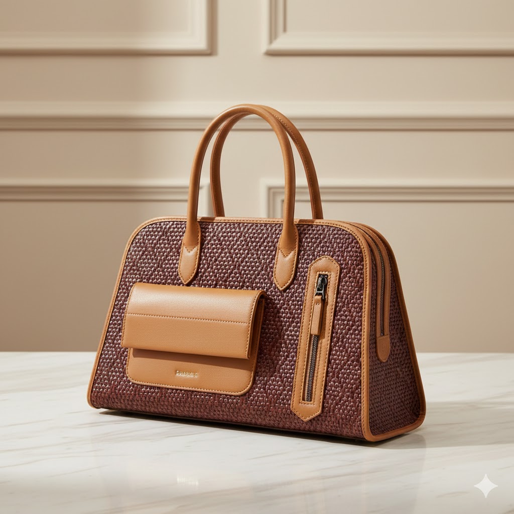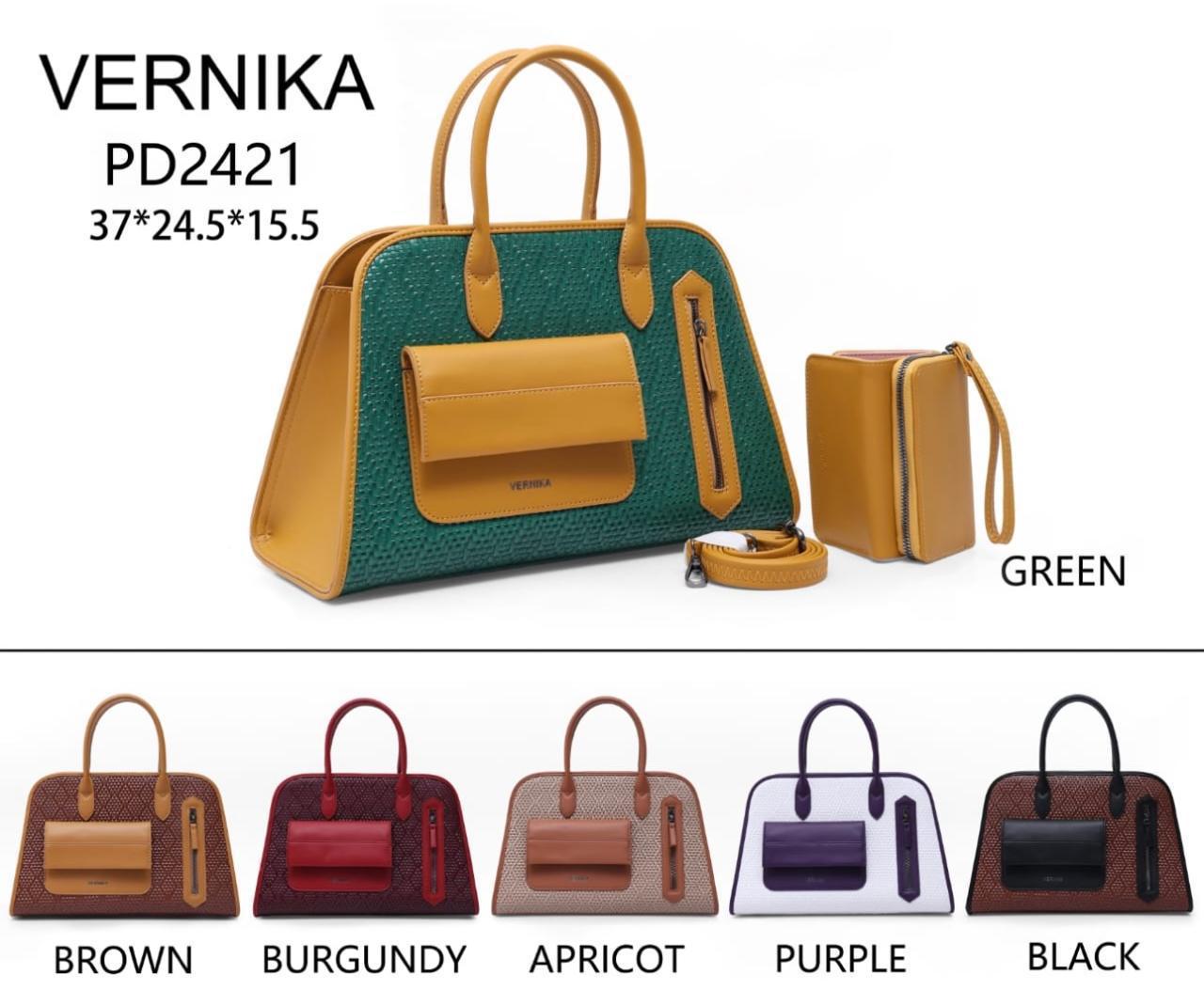 Description: Elevate your accessory collection with the VERNIKA PD2421, a sophisticated satchel designed for the modern professional. This handbag features a striking two-tone design with a rich, woven-textured body contrasted by smooth premium accents.